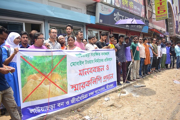 মৌলভীবাজারের লাউয়াছড়ায় সংরক্ষিত বনাঞ্চলে মোবাইল টাওয়ার নির্মাণের প্রতিবাদে শ্রীমঙ্গল শহরে মানববন্ধন করেছে পরিবেশবিদরা। বন, পরিবেশ ও জলবায়ু পরিবর্তন বিষয়ক মন্ত্রী বরাবর স্মারকলিপিও প্রদান করেন তারা।